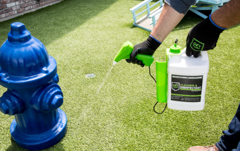 It is the only EPA-registered, one-step, ready-touse, non-toxic, synthetic turf disinfectant & cleaner with Hydrogen Peroxide and the scent of Fresh Real Grass! We partnered with renowned chemists to develop a health conscious, environmentally friendly product that is proven effective.